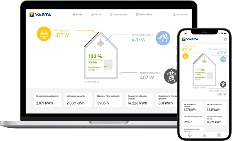 Im neuen VARTA Portal finden Sie alle Daten zu Ihrem Energiespeicher sowie Ein­stel­lungen und Ihre persönlichen Informationen an einem Ort. Sie können auf die Benutzer­oberfläche bequem von jedem Endgerät aus zugreifen.